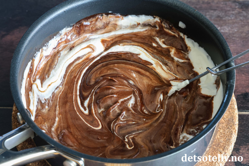 Det er viktig at sjokoladeblandingen er avkjølt, ellers smelter kremen.