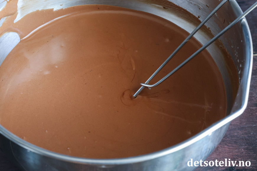 Nå er det viktig at sjokolademousseblandingen står kjølig helt til den begynner å tykne. Sett bollen i kjøleskapet i 2–3 timer, og rør i blandingen av og til. Sjokolademousseblandingen må bli tykk nok til at den ikke renner av kaken.