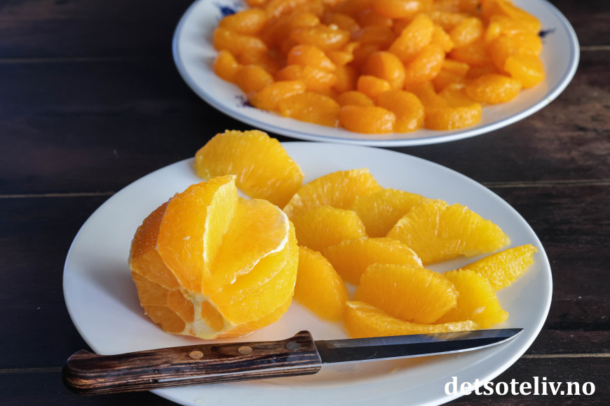 Jeg synes det ble skikkelig vellykket å kombinere søte, hermetiserte mandarinbåter med friske appelsinfileter!