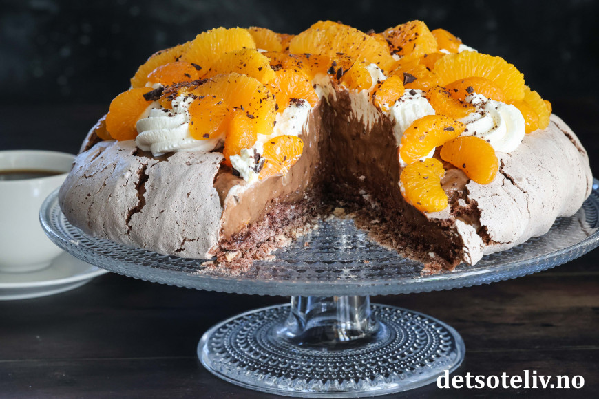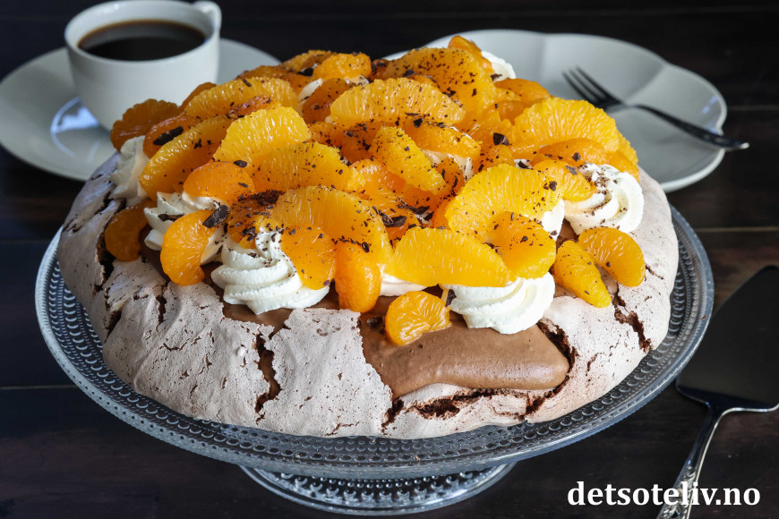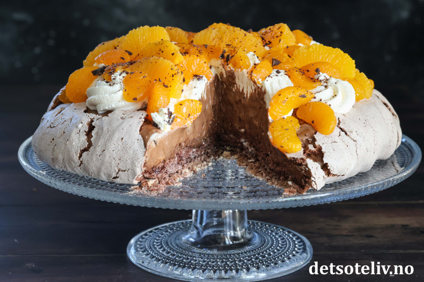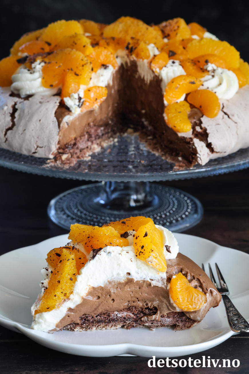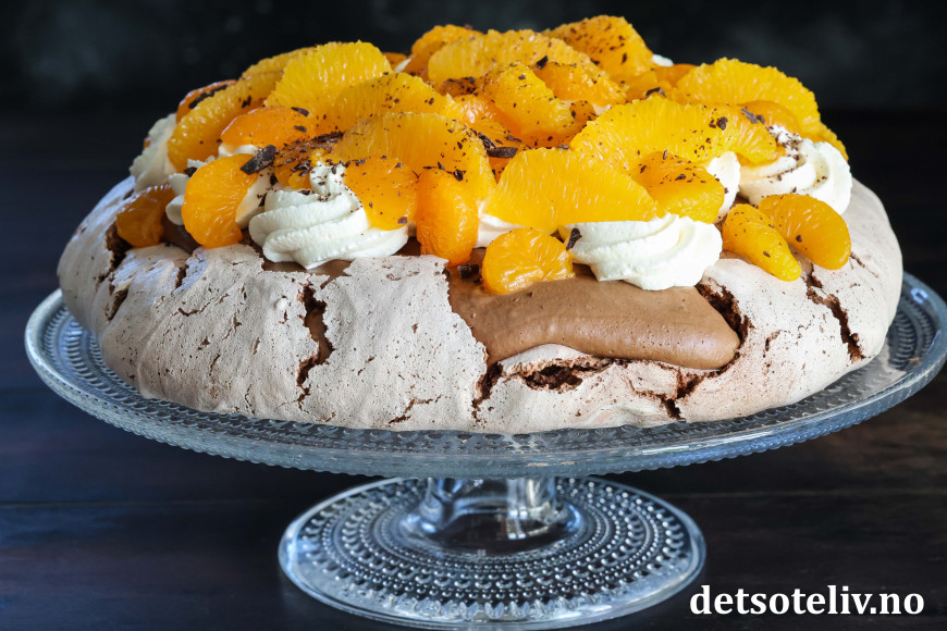 Dette er en virkelig lekker Pavlova med sjokoladesmak, som jeg har toppet med hjemmelaget sjokolademousse og pisket krem. Jeg har pyntet med mandarin- og appelsinbåter, som smaker nydelig sammen med sjokoladen.