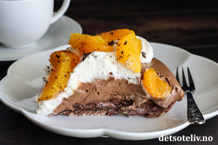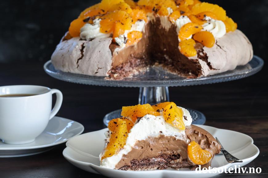 ♥ Det går fint å lage kaken over flere dager. Sjokolademarengsbunnen kan oppbevares tørt og i romtemperatur i flere dager. Du kan lage sjokolademoussen og fordele den over kaken dagen før servering. På serveringsdagen pynter du med fløtekrem og mandariner og appelsinfileter.