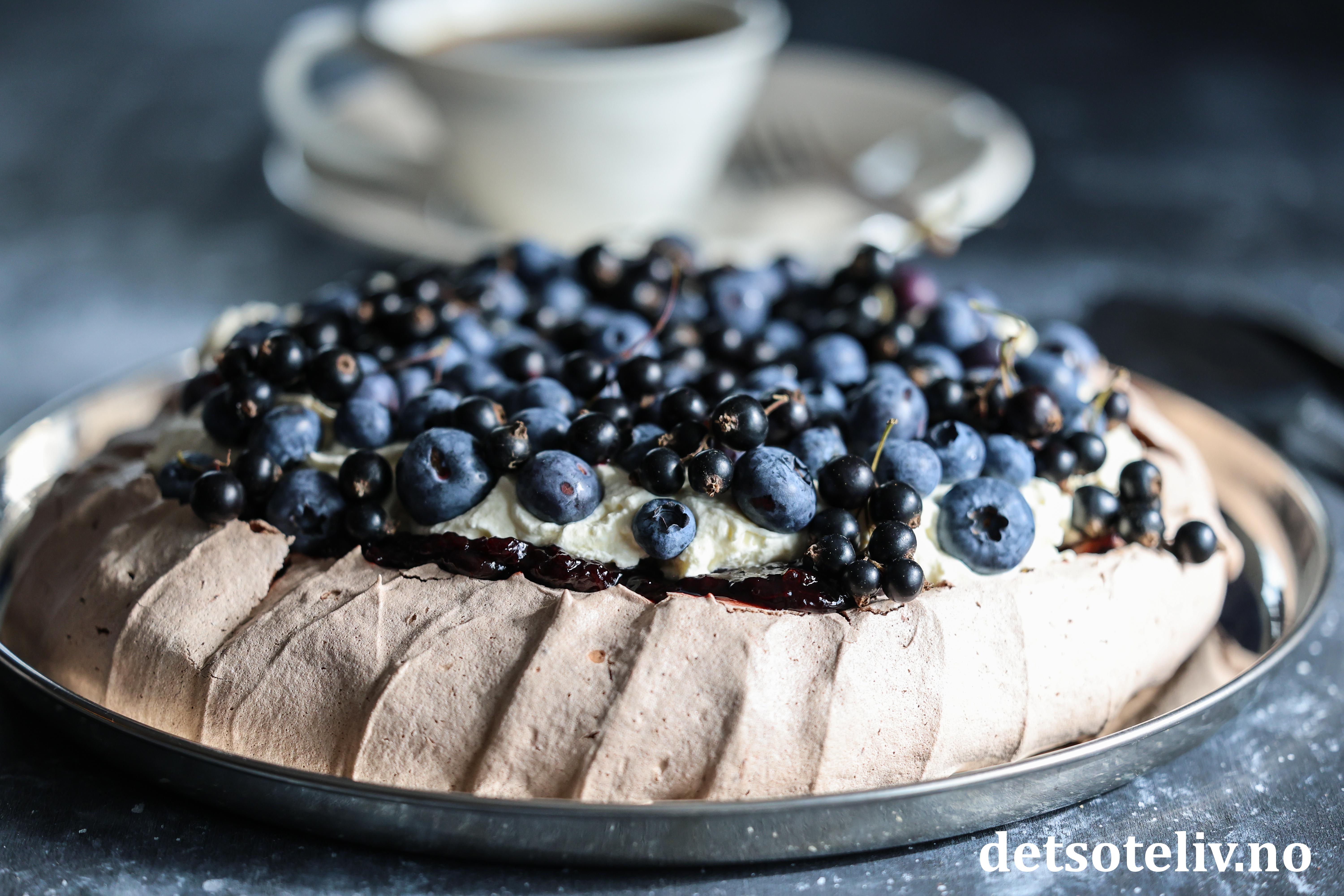 I disse tider fylt med storslåtte feiringer av sommer og kjærlighet, passer det med en nydelig festkake. Denne har en fantastisk sjokolademarengsbunn - perfekt sprø utenpå og bløt inni - som dekkes med solbærsyltetøy, masse pisket krem og herlige friske blåbær. Kaken pyntes med et kokett lite melisdryss.