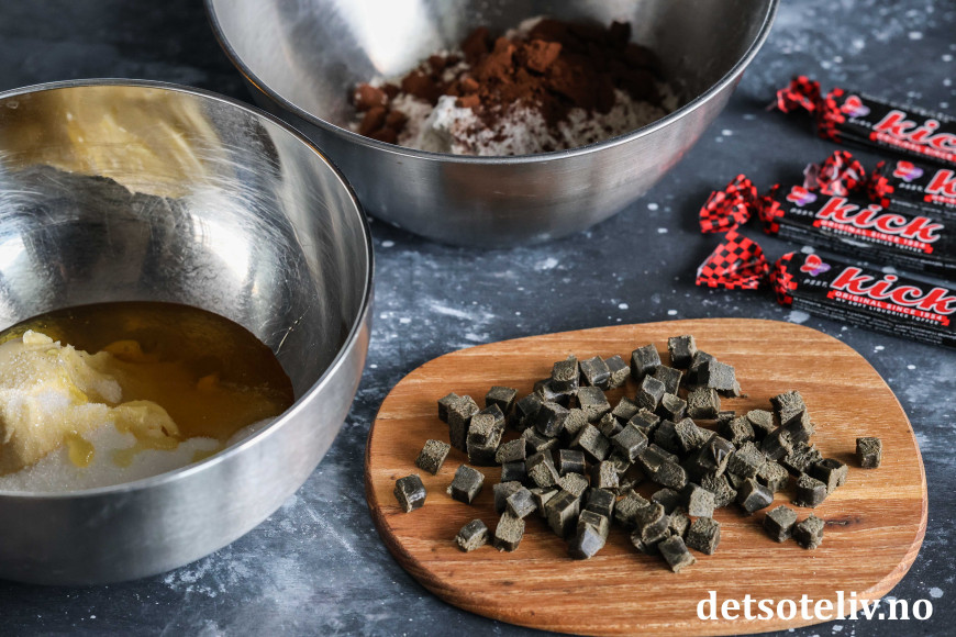 Ha mykt smør i en bolle sammen med sukker og sirup. Ha mel, vaniljesukker, natron og kakaopulver i en annen bolle. Skjær Kick Lakris i små biter.
