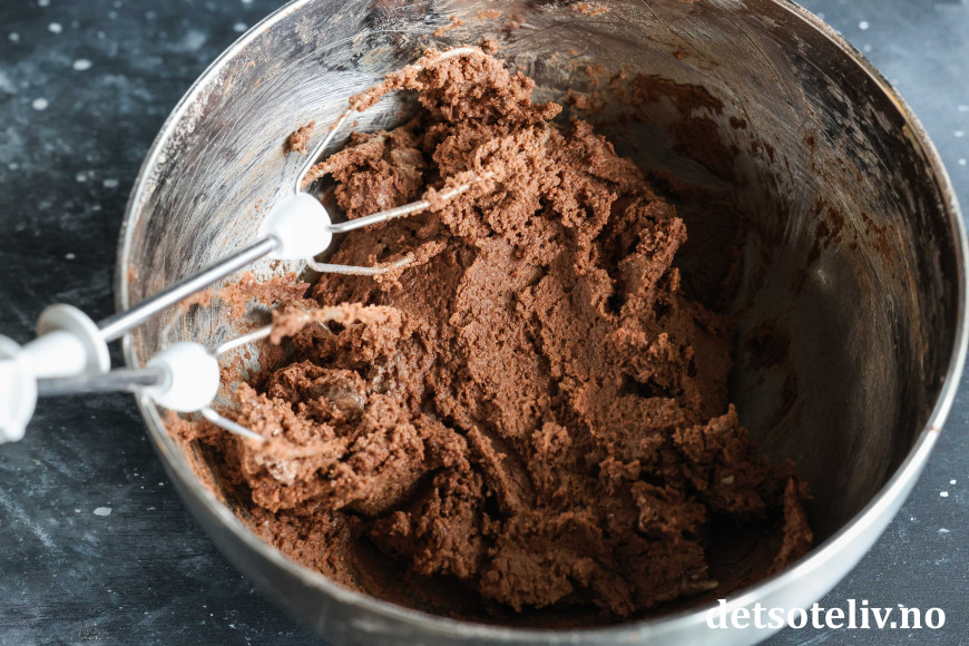 Ha mykt smør i en bolle sammen med sukker og sirup. Ha mel, vaniljesukker, natron og kakaopulver i en annen bolle.
