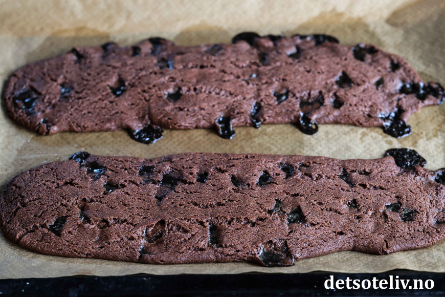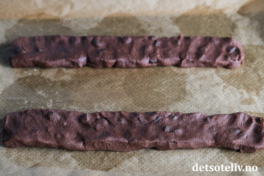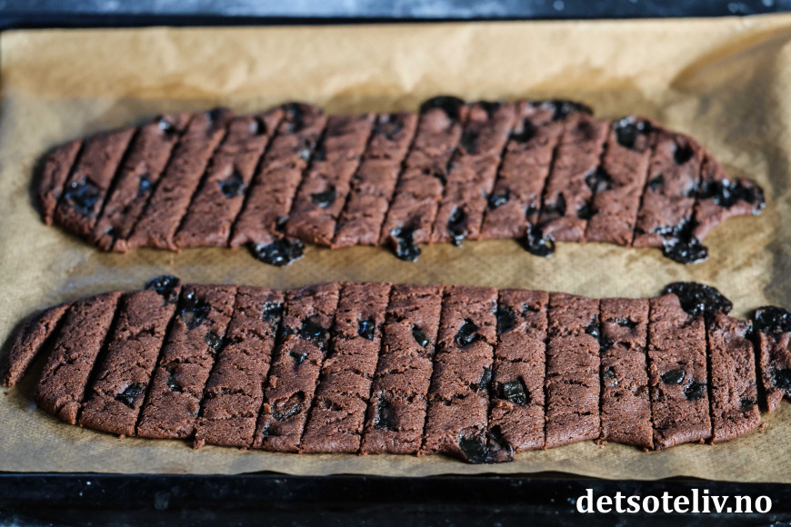Stekes midt i ovnen ved 175°C i ca. 15 minutter. Ta platen ut av ovnen og skjær lengdene opp på skrå mens de fortsatt er varme. Dra sjokoladepinnene litt fra hverandre og la de bli helt kalde på platen.