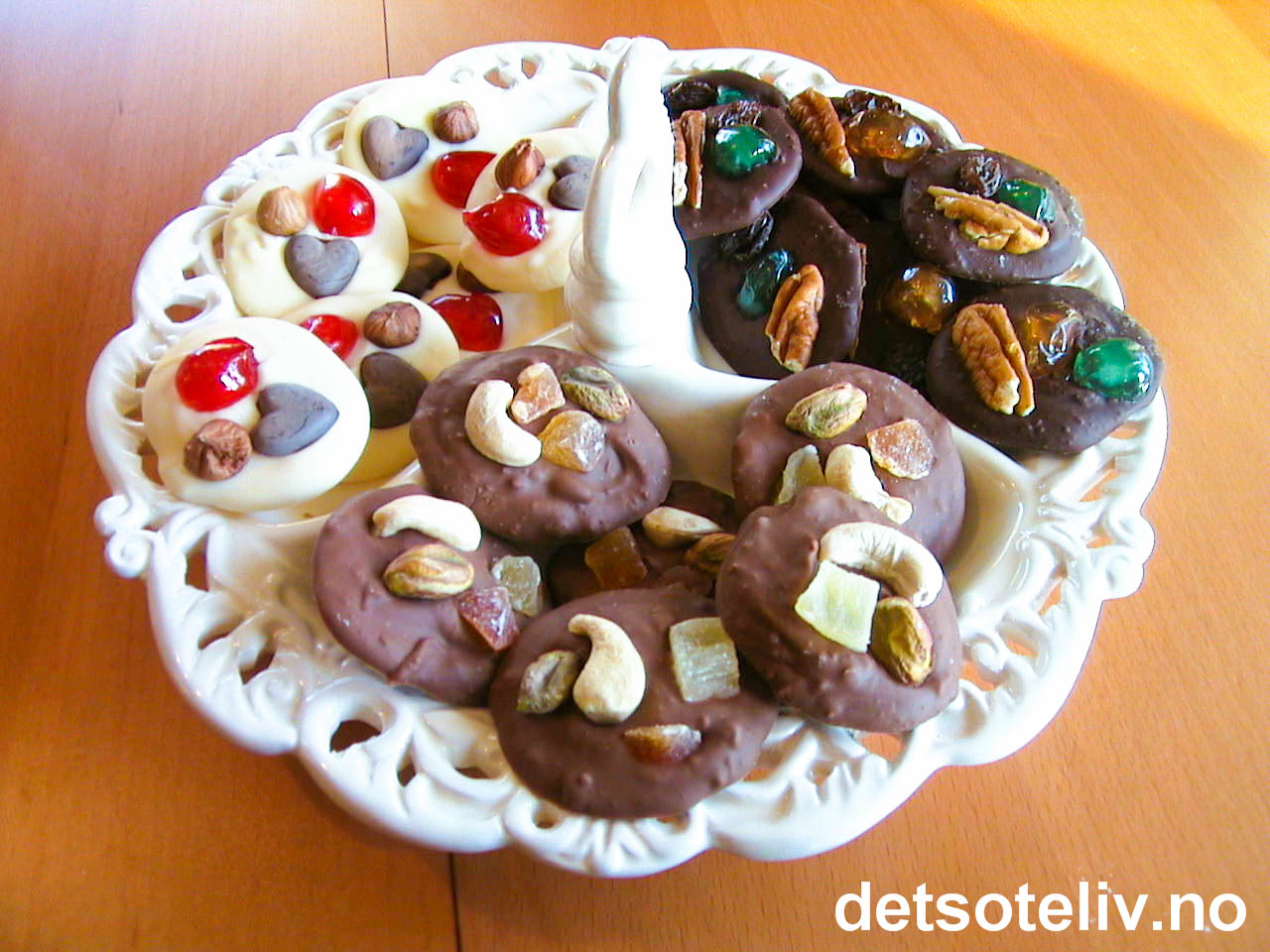 Fordel tørket frukt, hele nøtter og/eller sjokoladepynt på plettene mens sjokoladen fortsatt er myk. Eksempelvis er "Sjokoladeplettene" på bildet pyntet med følgende: