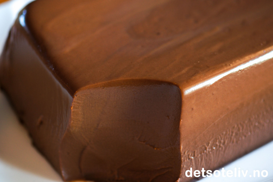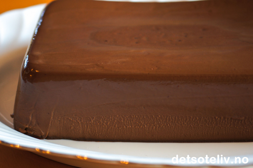 Ha blandingen i en avlang form som rommer 1,5 liter. Sett formen i kjøleskapet over natten, så sjokoladepuddingen stivner.