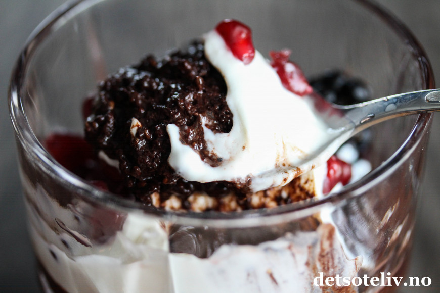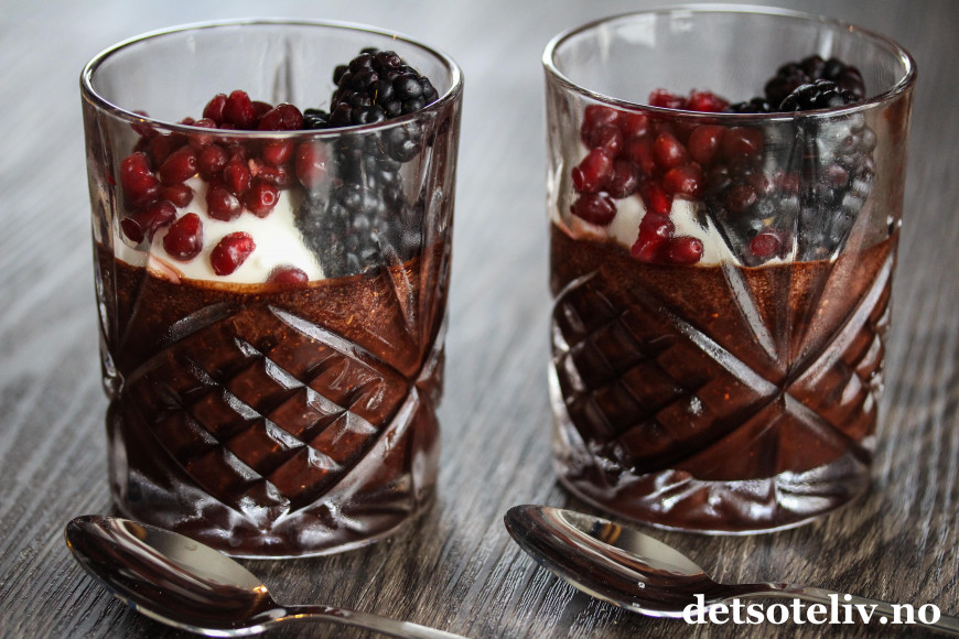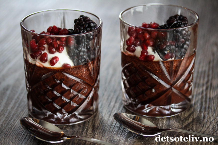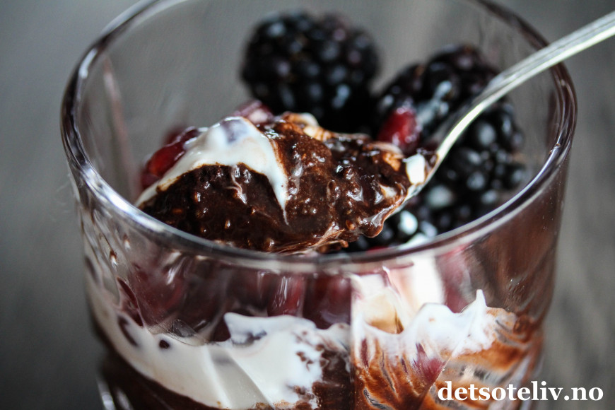 ♥ Chiafrø gir tykkelse på denne sjokoladpuddingen, men konsistensen her blir såklart ikke den samme som vanlig sjokoladepudding laget med gelatin (du finner flere oppskrifter på vanlig sjokoladepudding og sjokolade-panna cotta her på Det søte liv). Til gjengjeld er jo chiafrøene supersunne!