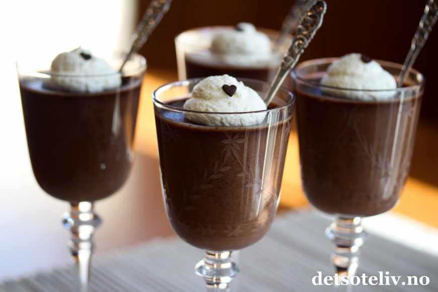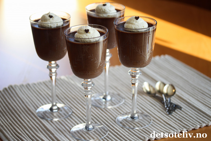 Veldig god dessert, men porsjonene er store. Kan godt bruke mindre glass/skåler slik at det blir til 6 i stedet. Jeg brukte også friske bær på toppen i stedet, noe som gjorde det hele mye friskere, og syrligheten fra bærene passet veldig godt til den mektige sjokoladen.