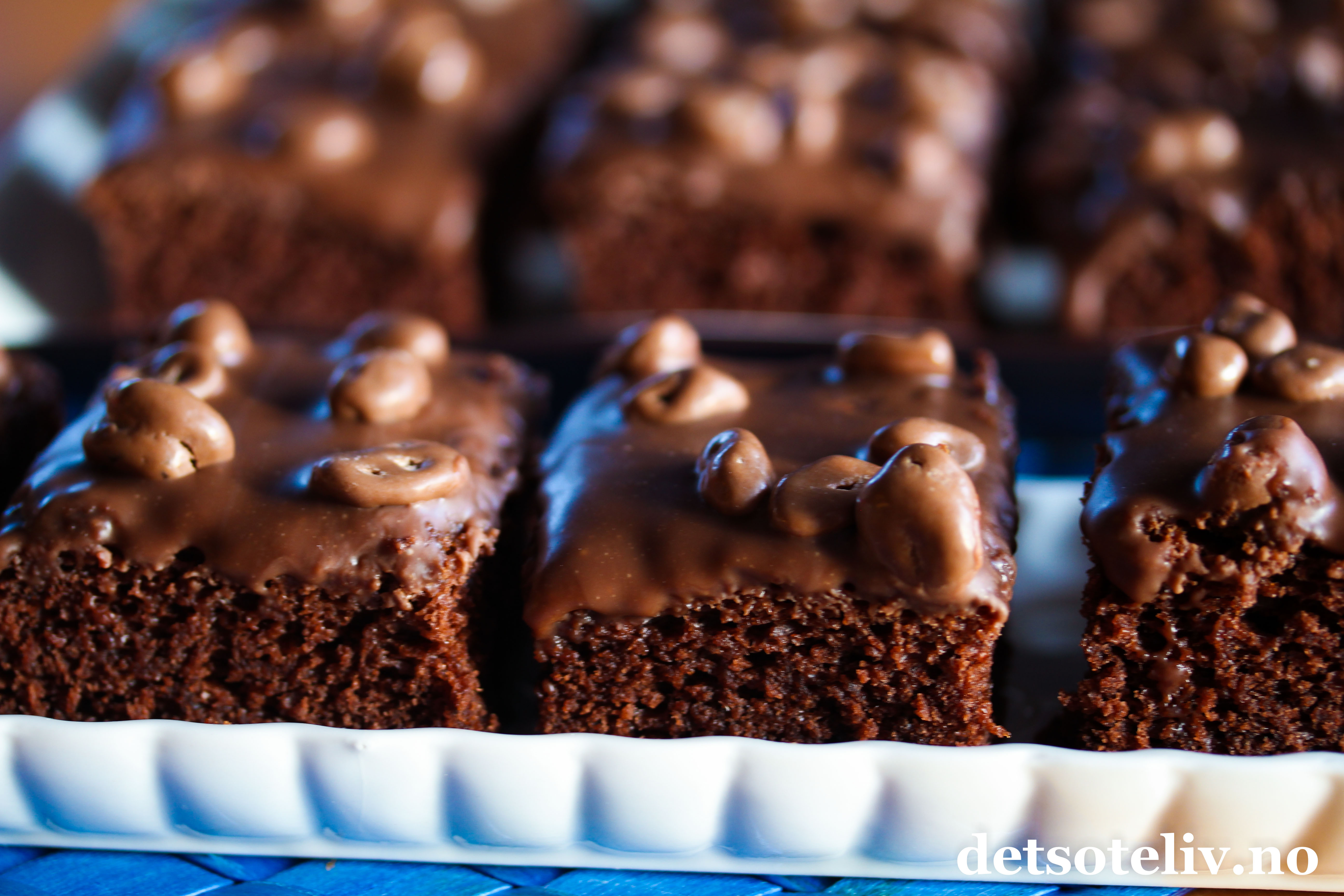 Kok opp kremfløten i en liten kjele. Brekk i melkesjokoladen og la den smelte i fløten på svak varme. Rør glasuren blank og jevn. Smør glasuren over den avkjølte kaken. Dryss over sjokoladerosiner. Avkjøl til glasuren har stivnet og del kaken opp i passe store firkanter.