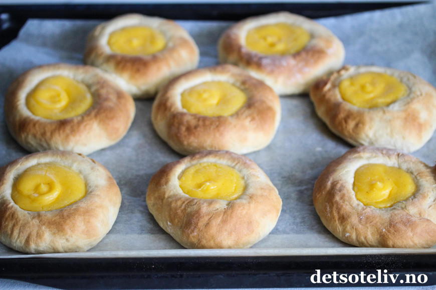 Det er viktig at du trykker helt ned til platen når du presser hullet i midten på de etterhevede bollene. Under steking vil bollene heve seg en god del. Hvis du ikke har presset hullet helt godt ned vil vaniljekremen flyte over og renne utover bollene under steking.