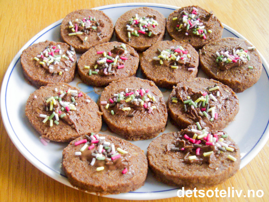 Smelt sjokoladen over vannbad eller i mikro. Smør en liten klatt sjokolade på hver kake og dryss over med kakestrøssel. Sett kakene i kjøleskapet til sjokoladen har stivnet.