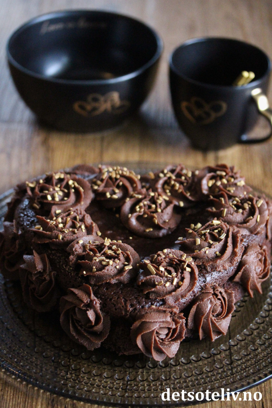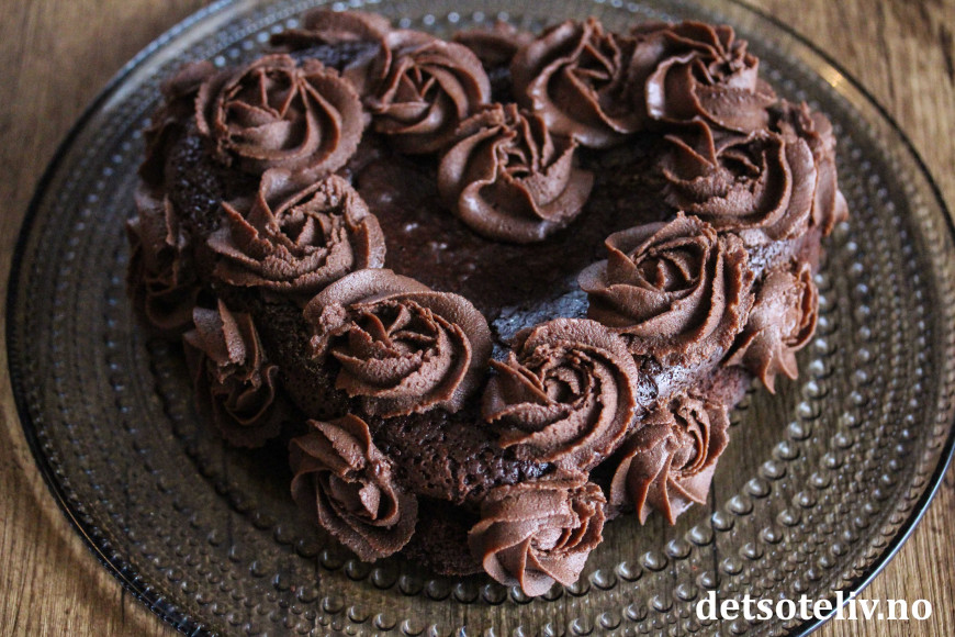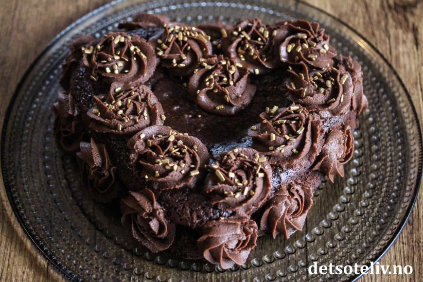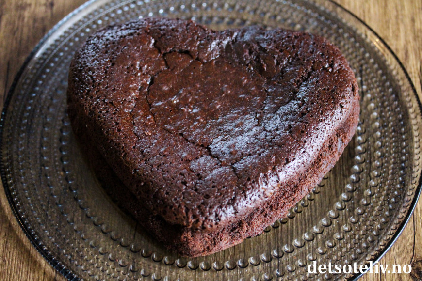 Finn frem en hjerteform eller rund form (22-24 cm i diameter) og legg bakepapir i bunnen. Hell deigen i formen. Stek kaken midt i ovnen ved 175°C i 20-30 minutter. Kaken skal da være gjennomstekt i sidene, men forsatt virke bløt og litt ustekt i midten. Ta kaken ut av ovnen og avkjøl i romtemperatur. La den så stå i kjøleskapet i noen timer, og gjerne over natten.
