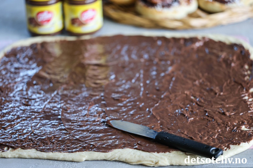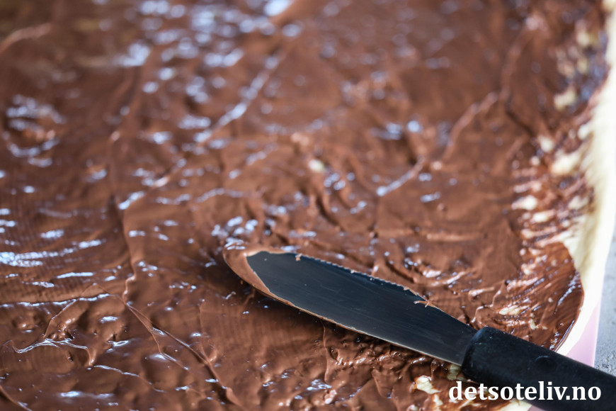 Kjevle ut hver del til en stor, avlang leiv. Smør på innholdet i 1 glass Freia Sjokonøtt. Det er en nydelig smørekonsistens på Freia Sjokonøtt, så det er veldig lett å få Freia Sjokonøtt utover deigen i et passe tynt lag.