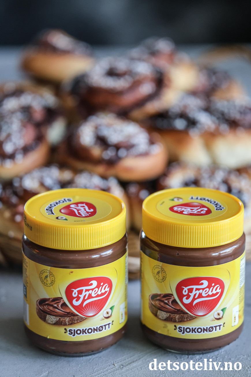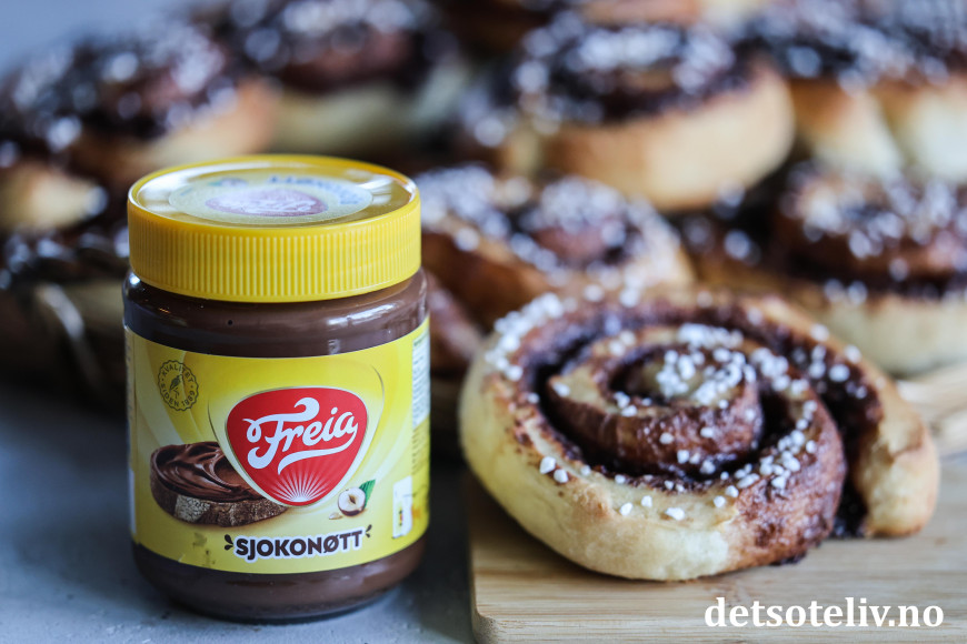 I dag er det «Kanelbollens dag», og du finner fra før mange, herlige varianter av kanelboller her på Det søte liv. I år fikk jeg lyst til å lage en vri på bollene, og fylle dem med det nye Sjokonøtt-pålegget til Freia!