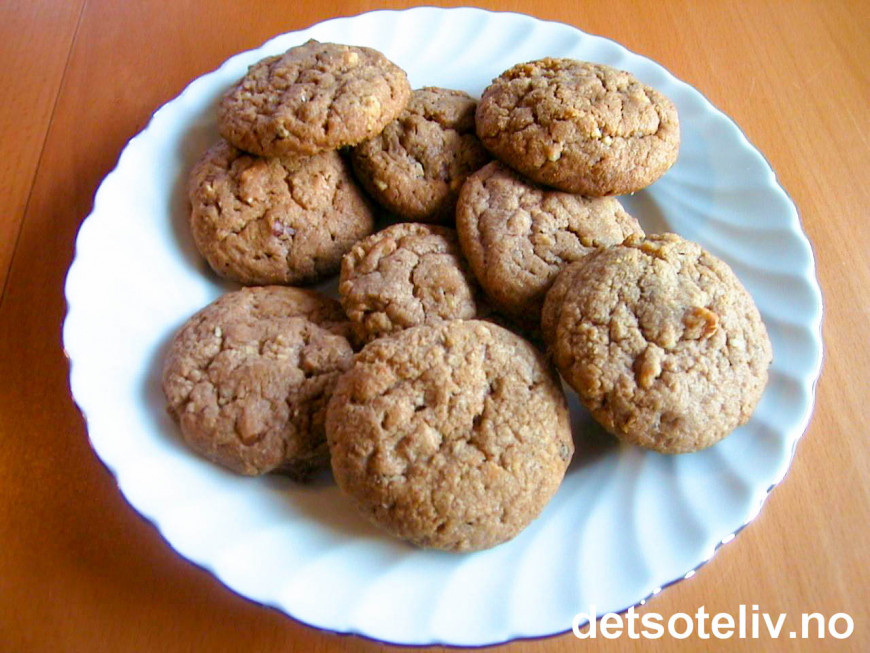 Stek kakene midt i ovnen ved 180°C i 15 min. Avkjøl kakene litt på platen før de flyttes over på rist med en stekespade og avkjøles helt.
