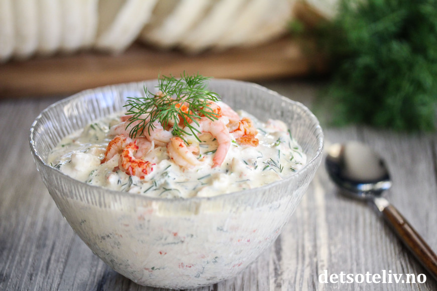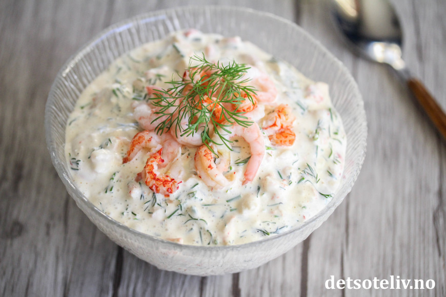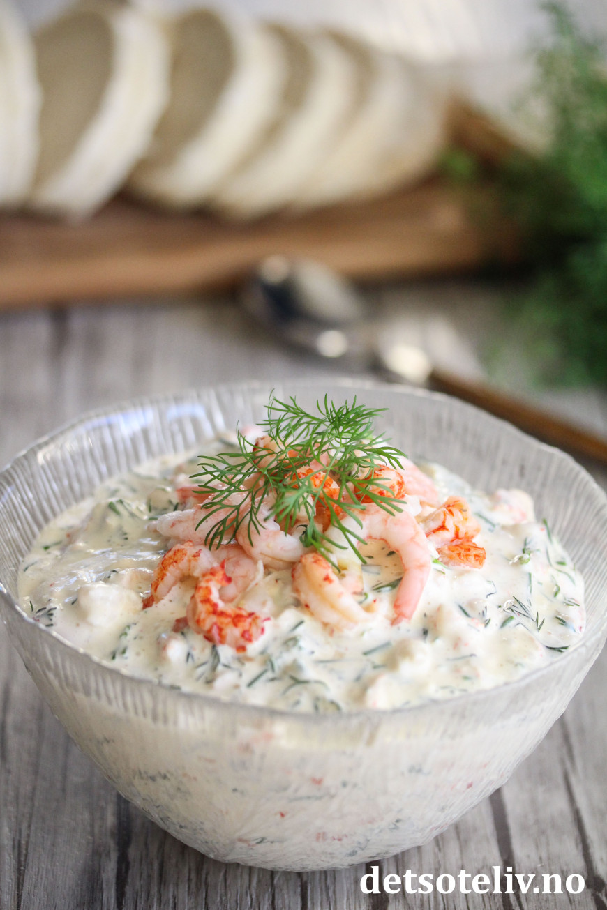 Ha røren i en serveringsskål og pynt med et par hele reker, krepsehaler og litt dill.
