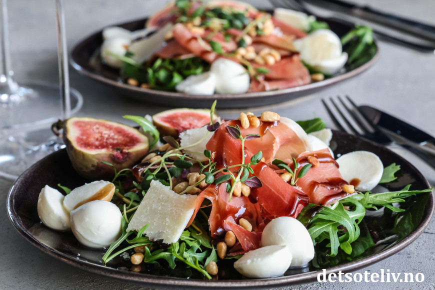 Det er gode, italienske råvarer som står i sentrum: Ferske fiken legges på ruccolasalat sammen med god spekeskinke og fersk mozzarella. Tallerkenen toppes med olivenolje, søt balsamico glaze, friske urter, ristede pinjekjerner og høvlet parmesan.