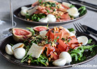 ♥ Det beste er å sette sammen forretten rett før servering. Det går imidlertid også an å forberede forretten ved å legge ingrediensene klare på asjetten, men dekk da godt til med plastfolie og oppbevar i kjøleskapet frem til servering. Du bør imidlertid vente med å ringle over olivenolje og balsamico glaze til rett før servering, ellers kommer ruccolasalaten til å miste sin spenst.