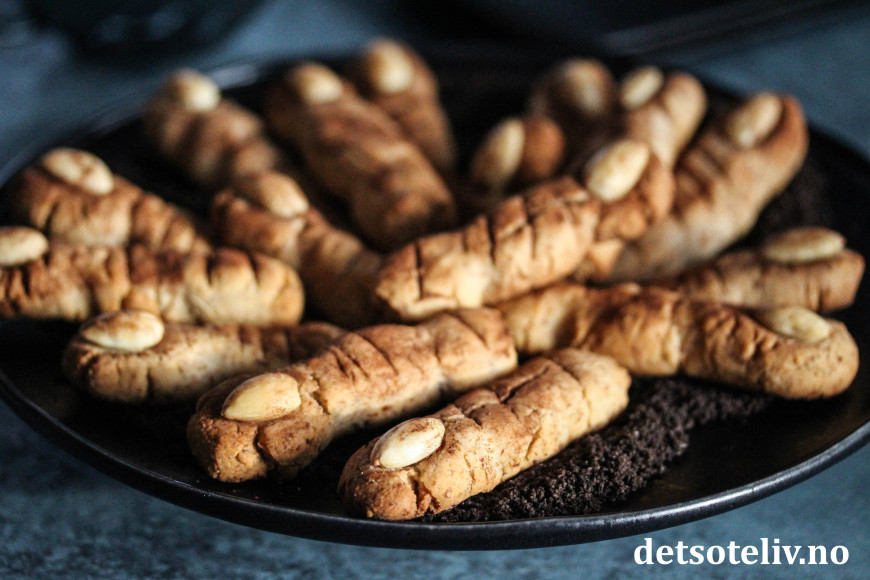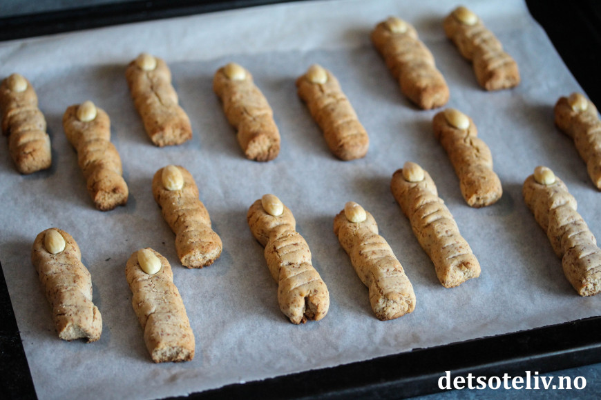 ♥ Jeg lagde fingrene litt tykke og knoklete fordi jeg liker at kransekakene er myke inni. Dersom du i stedet vil ha lange, tynne heksefingre, er det ikke noe i veien for å forme dem slik, men husk at tynne fingre trenger kortere steketid. Følg med underveis i stekingen så kakene ikke blir for mye stekt, for da blir de harde.