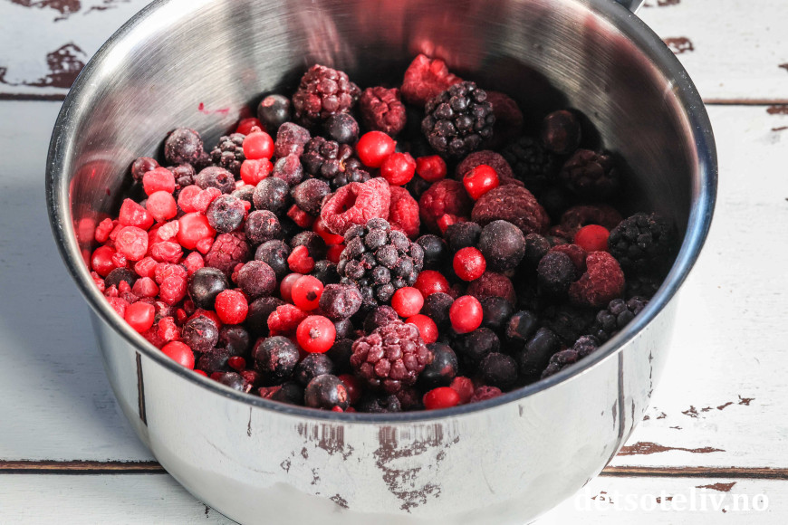 ♥ Jeg har her brukt 1 pakke frosne skogsbær (400 gram) til fromasjen. Det lønner seg å ha bærene i frosne i kjelen og så la dem tine i romtemperatur en stund slik at de begynner å safte seg før du setter kjelen på varmen. Det er ikke meningen å tilsette noe vann i bærblandingen.