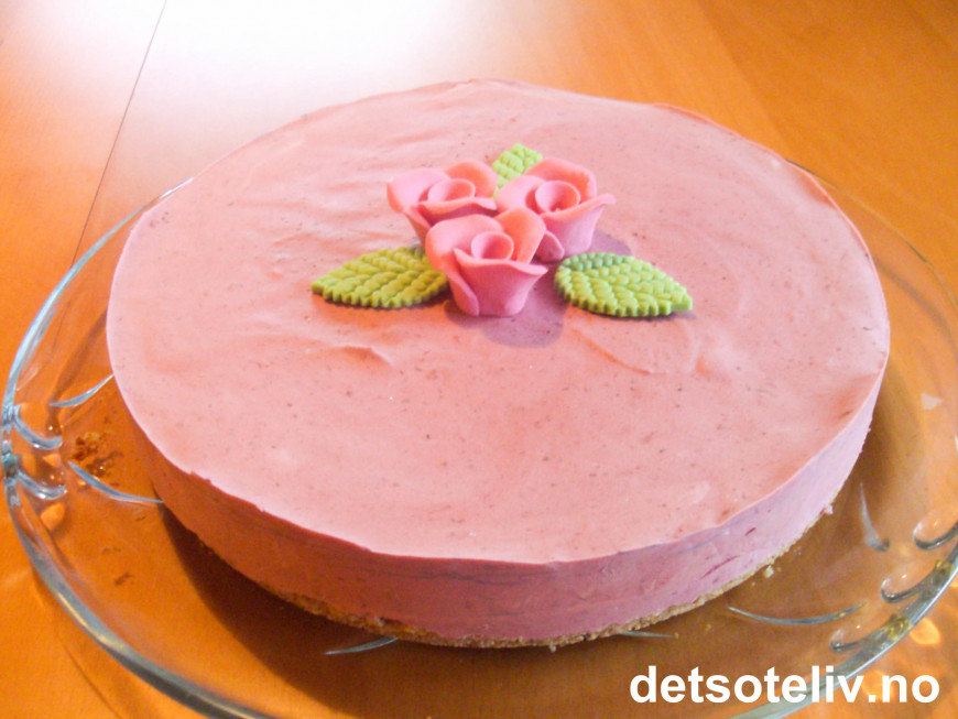 Ta kaken ut av formen 20 min før servering. Dra av bakepapiret fra undersiden av den frosne kaken før kaken settes på et fat. Pynt kaken eventuelt med marsipanroser eller annen kakepynt.