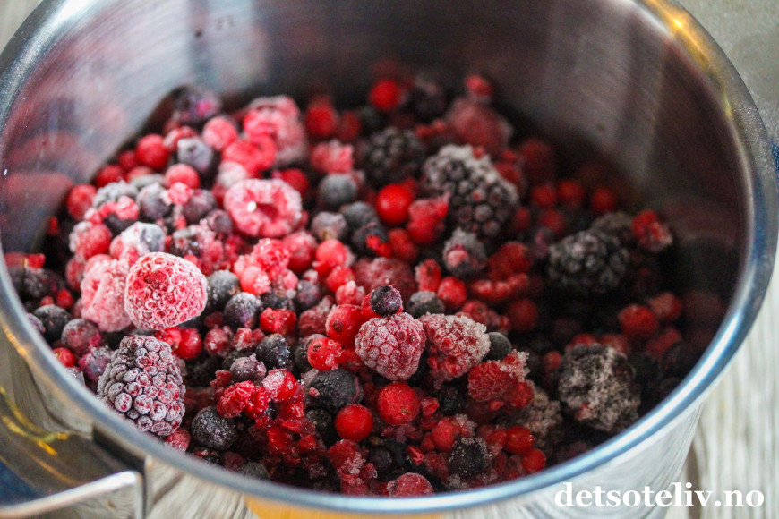 ♥ Frossen skogsbærblanding fås kjøpt i de fleste, norske matbutikker. Blandingen inneholder en miks av bjørnebær, bringebær, blåbær, rips og solbær. Du kan i stedet sette sammen din egen blanding av bær (friske eller frosne).