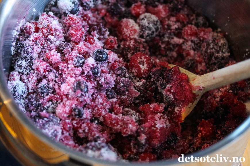 Ha skogsbær i en kjele. Tilsett sukkeret. La dette eventuelt stå i 30 minutter slik at bærene begynner å safte seg.
