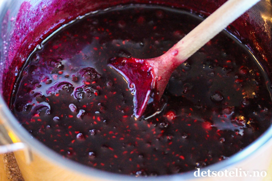 Varm opp blandingen og la syltetøyet småkoke i ca. 10 minutter.