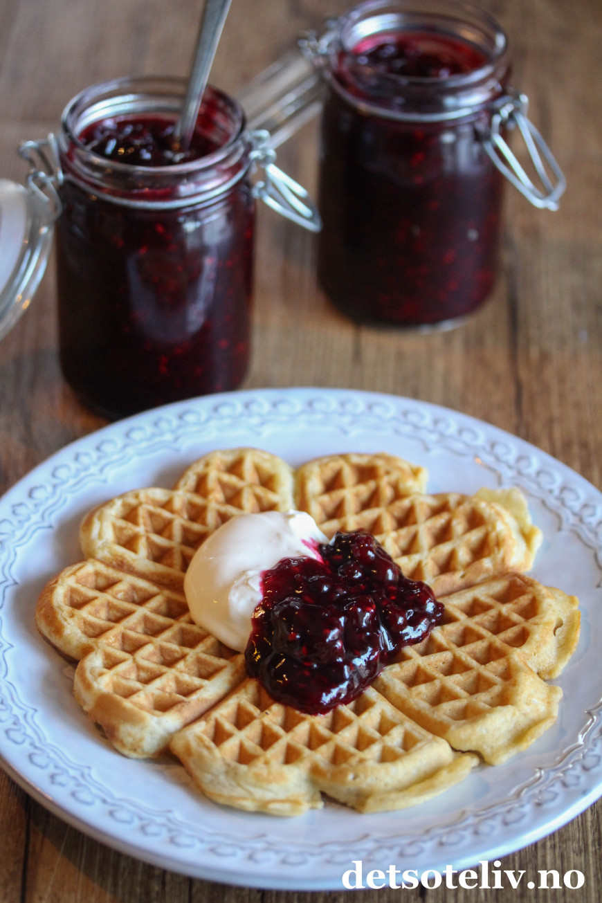 Eller nyt den himmelske smaken av en nystekt vaffel med rømme og skogsbærsyltetøy!