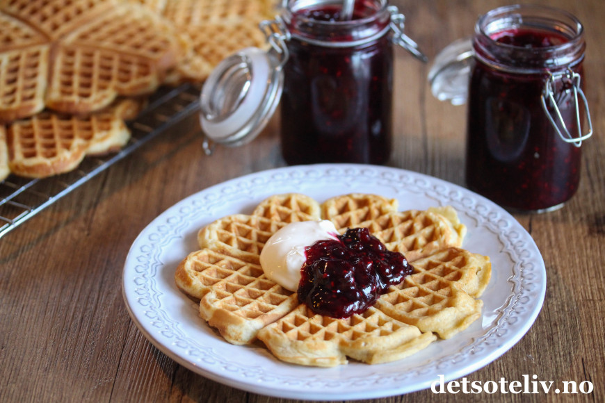 Ble du fristet til å lage vaffel med rømme og skogsbærsyltetøy? Du finner nesten 100 vaffeloppskrifter her på Det søte liv. Se for eksempel Myke vafler med surmelk eller Havremelsvafler.