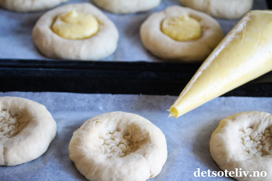 Ha eggekremen i en sprøytepose og fyll opp fordypningen i bollene med masse eggekrem.