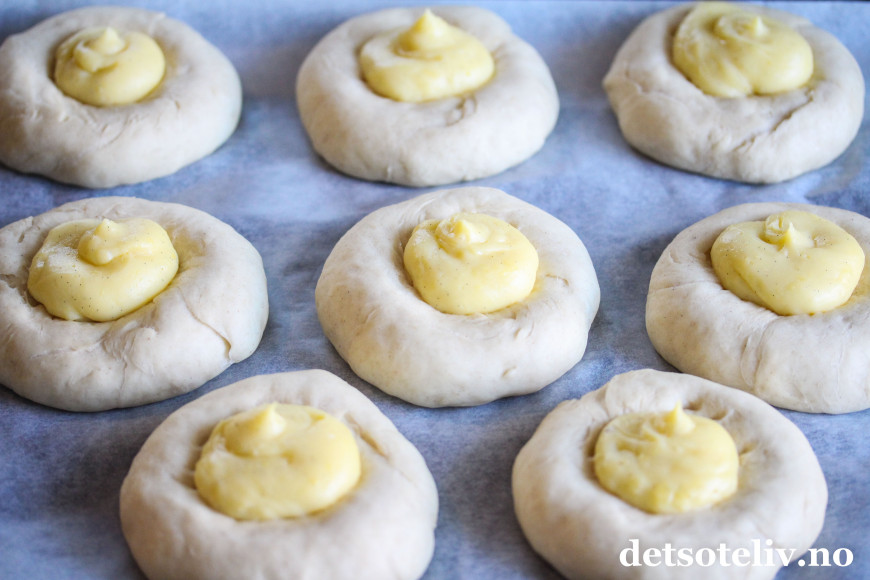 Trill ut bollene med en gang (ca 20 stk) og legg dem på bakepapirdekkede stekeplater med god avstand imellom. Trykk bollene helt flate med hendene. La dem deretter heve lunt i 1 time. Når bollene er ferdighevet, trykk en stor fordypning i midten av hver bolle med fingrene.
