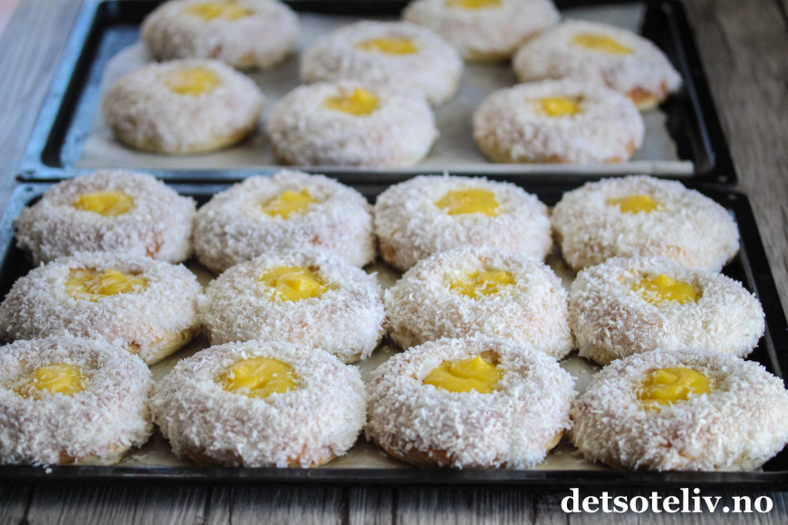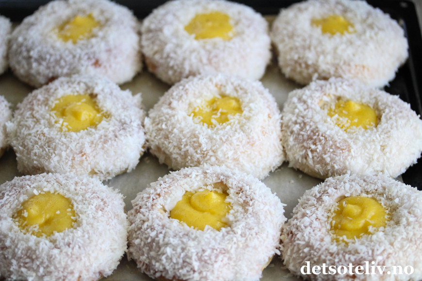 Stek bollene midt i ovnen ved 220°C i ca. 10 minutter. Avkjøles helt.