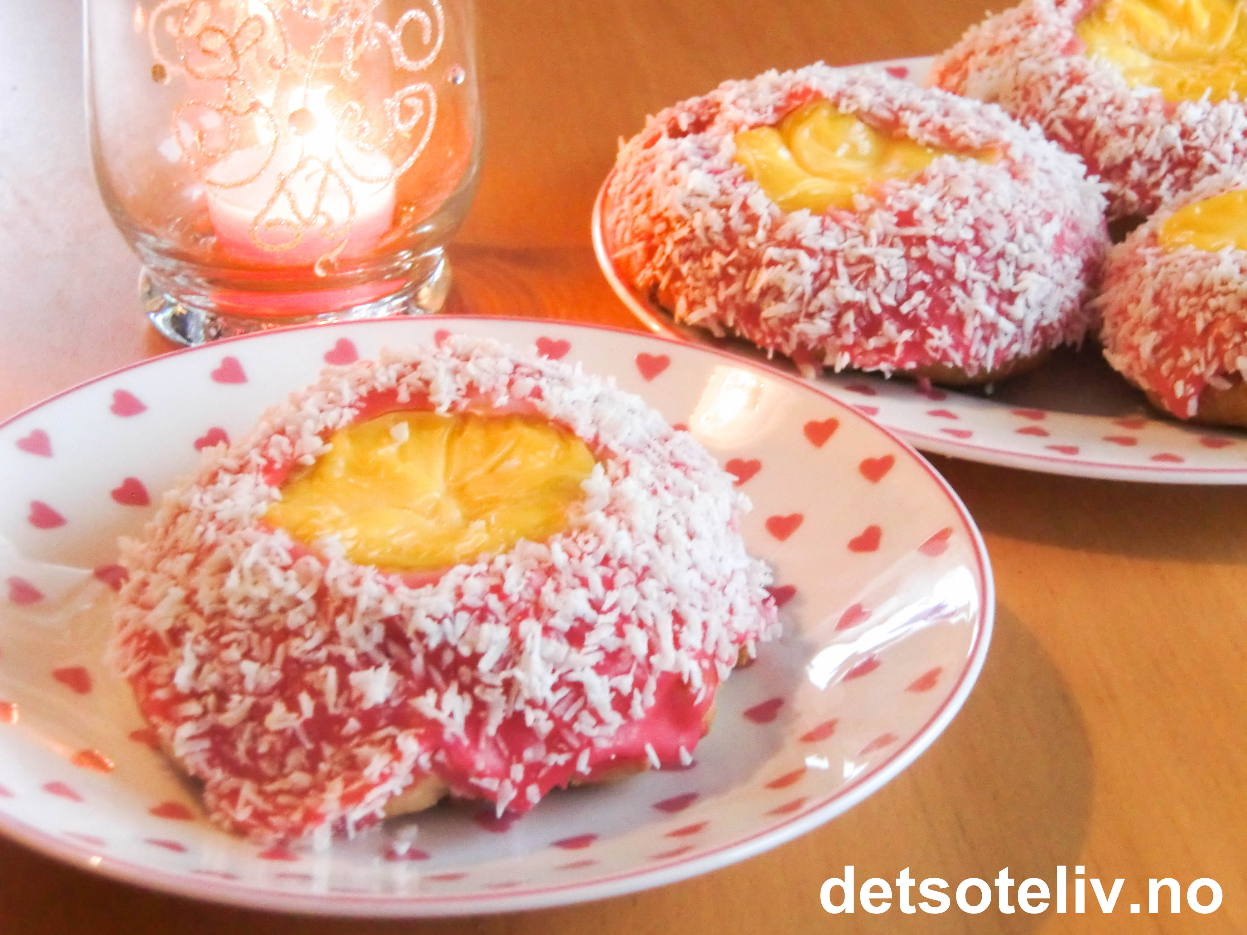 Lag melisglasur av jordbærmelis og vann. Smør melisglasur rundt vaniljekremen med en smørekniv. Ha kokos i en skål og klem kanten på de nyglaserte bollene ned i skålen, slik at kokosen fester seg i melisglasuren. La bollene stå til glasuren har stivnet.