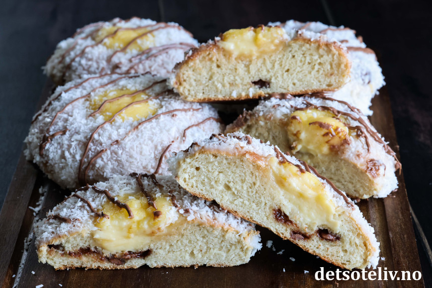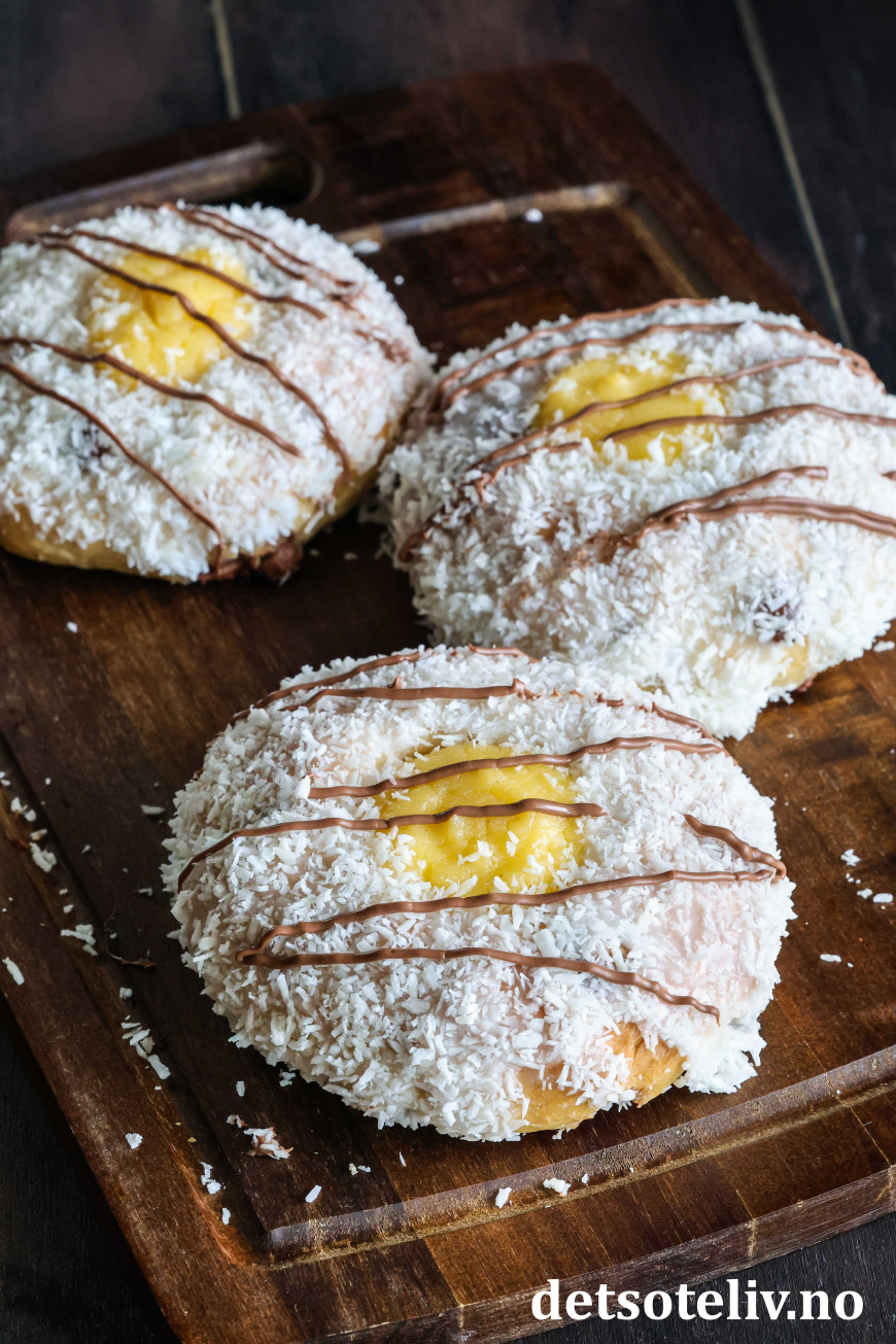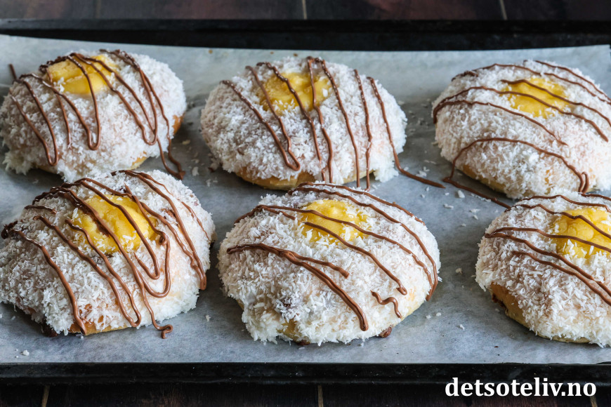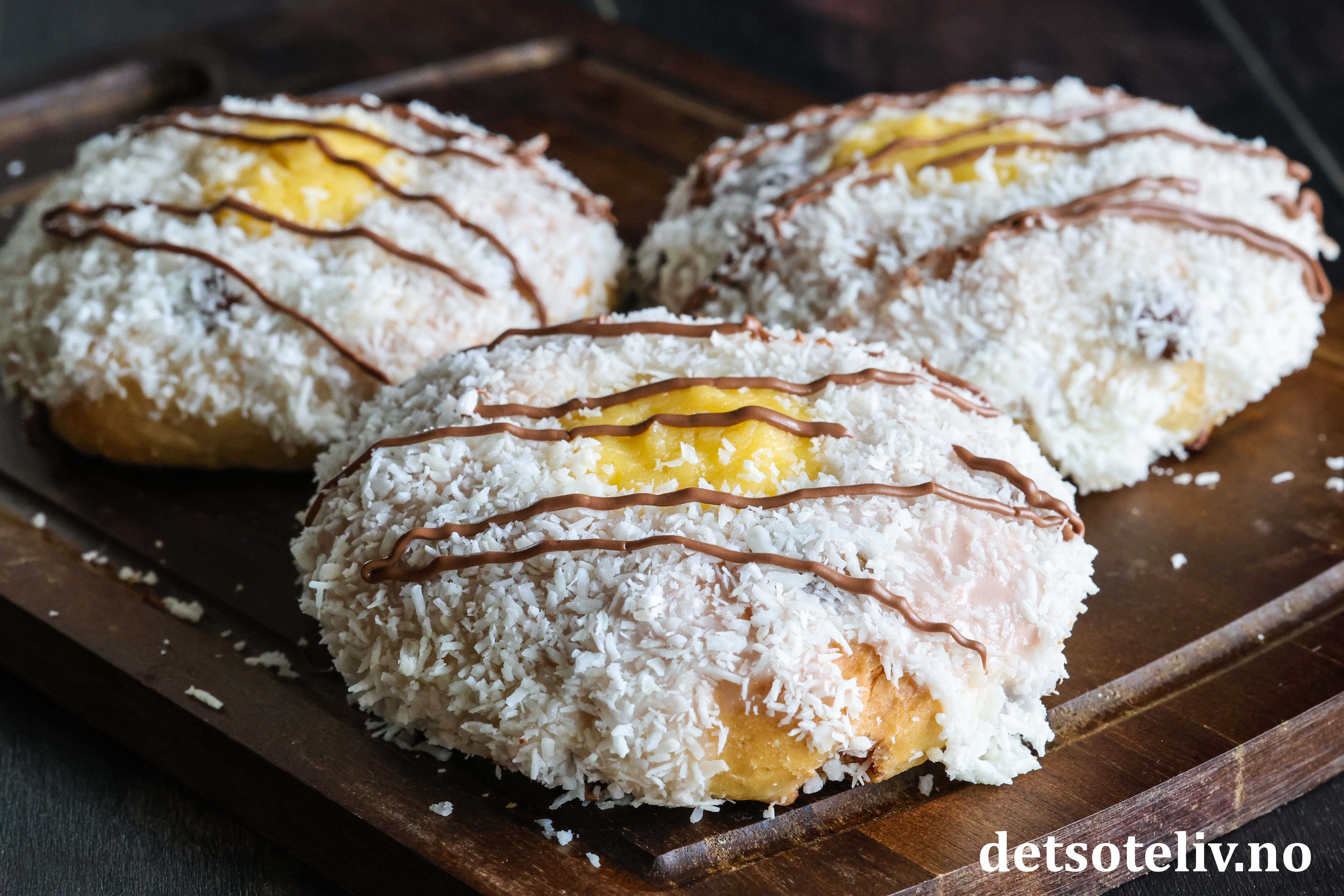 ♥ Se også Solskinnsboller med melkesjokolade, som er samme boller uten melisglasur og kokos.