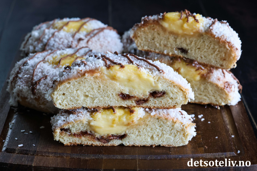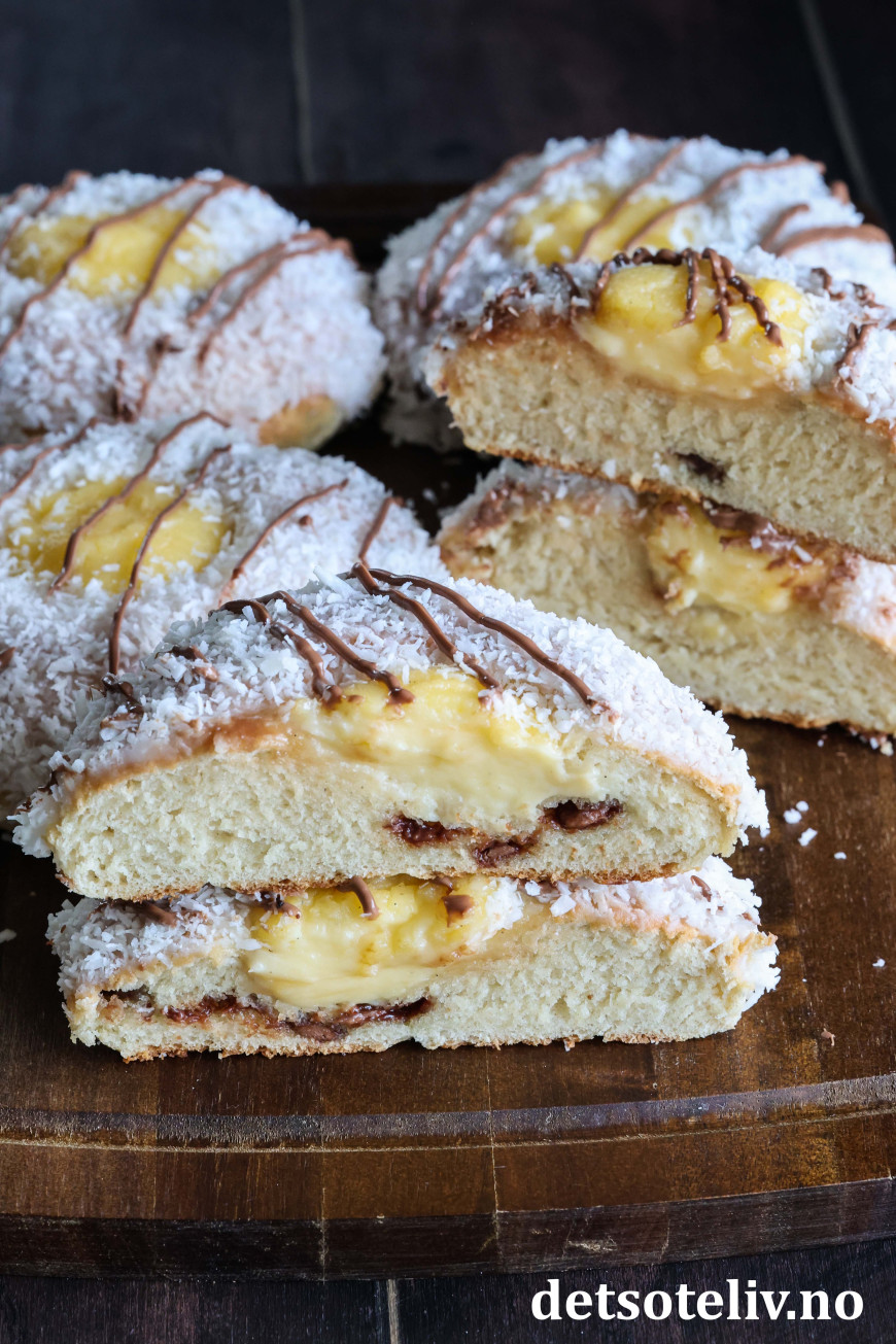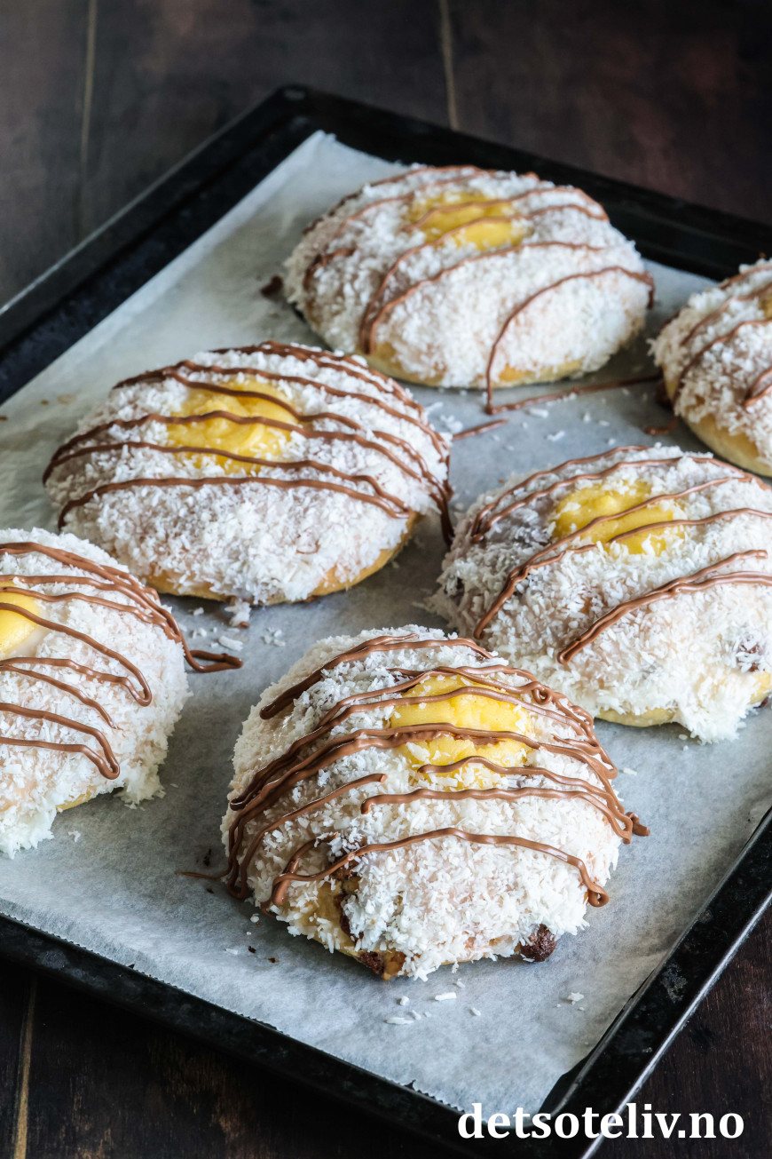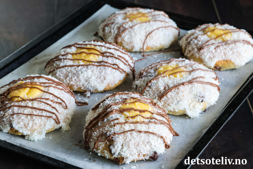 ♥ Se også Solskinnsboller med melkesjokolade, som er samme boller uten melisglasur og kokos.