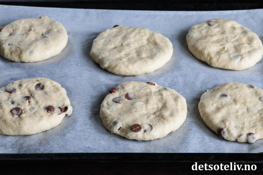 Ha deigen ut på bakebordet og kna inn melkesjokoladechips (eller grovt hakket melkesjokolade).