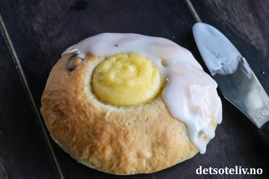 ♥ Det er viktig at du presser gropene godt ned slik at det blir god plass for vaniljekremen, ellers risikerer du at vaniljekremen flyter utover når bollene hever under stekingen.