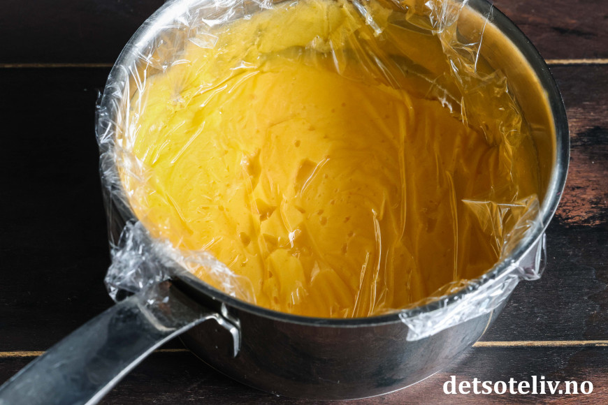 Ta kjelen av platen og la vaniljekremen avkjøles til romtemperatur. Rør av og til. Sett så vaniljekremen i kjøleskapet til den er helt tykk (gjerne over natten, men dekk da gjerne over med litt plastfilm så det ikke danner seg snerk på overflaten).