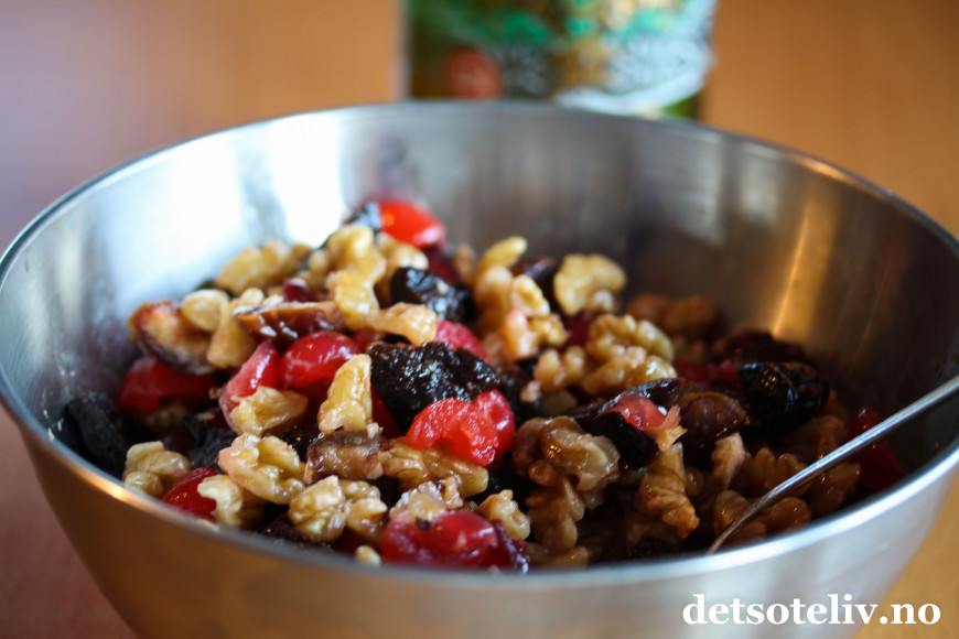 Del cocktailbær, dadler og svisker i biter. Grovhakk valnøttene. Bland dette med whisky og la stå og trekke i kjøleskapet over natten.