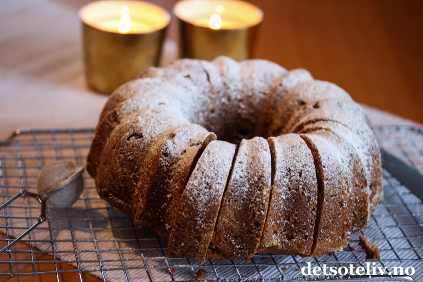 Stek kaken midt i ovnen ved 150°C i ca 1,5 time. Avkjøl kaken litt i formen før den forsiktig hvelves ut.