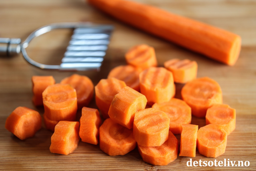 I mens kan du rense gulrøtter og skjære dem i mindre biter. Disse kokes møre i vann.