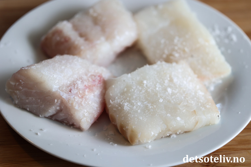 Skyll saltet av fiskestykkene i rennende, kaldt vann. Tørk dem lett med kjøkkenpapir.