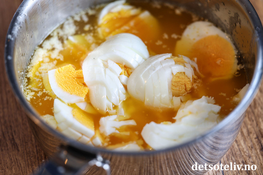 ♥ Dersom du ikke har eggdeler, hakker du opp eggene med en kniv i stedet.