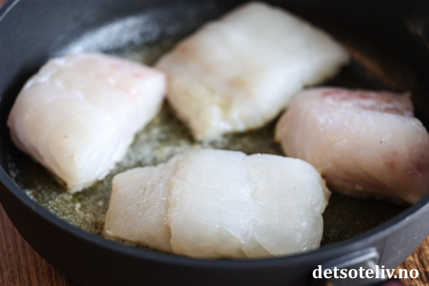 Varm opp olivenolje og smør i stekepannen og legg fiskestykkene i pannen.