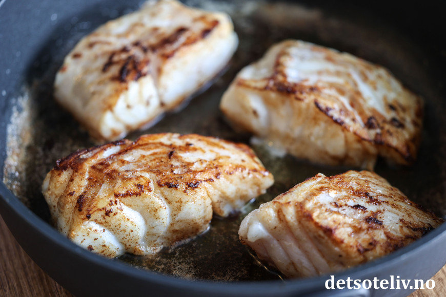 Her har jeg brukt loin av fersk skrei, som jeg har stekt i panne. Utenom skreisesongen går det selvsagt fint å bruke vanlig torskeloin.