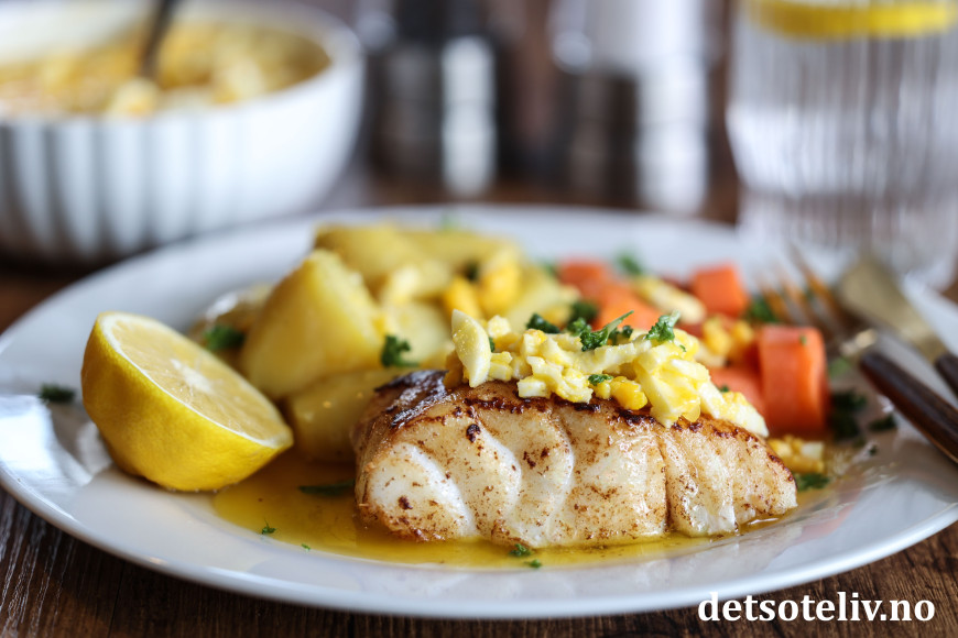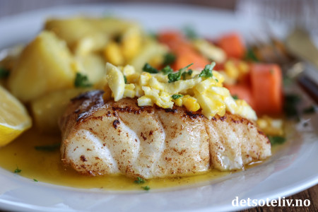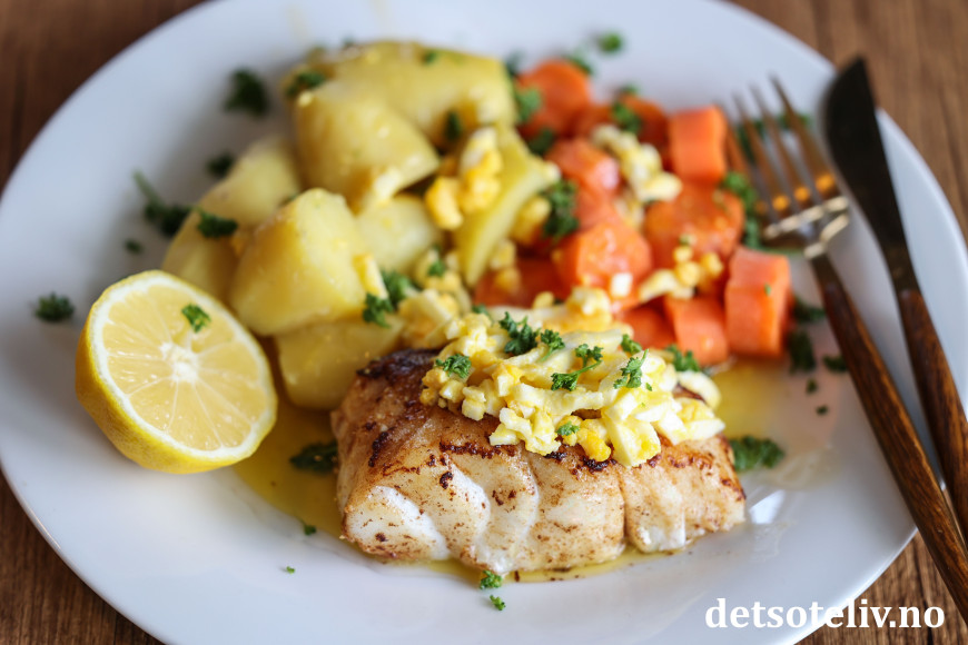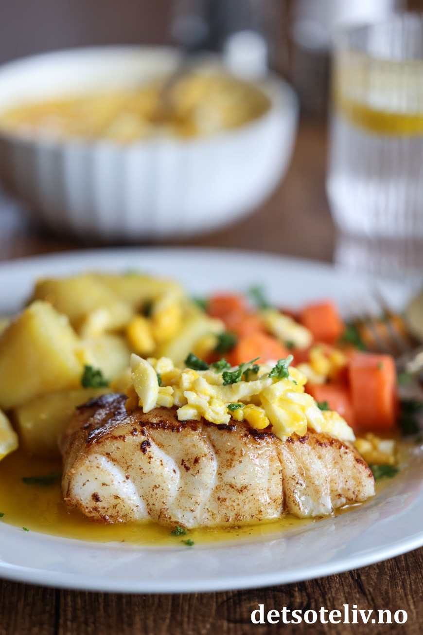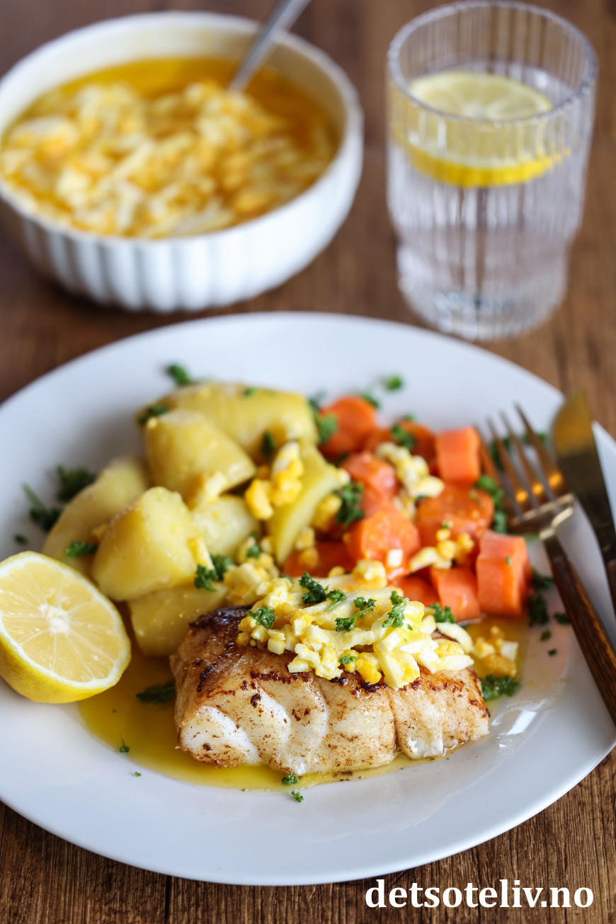 Stekt skrei servert med mandelpoteter, gulrøtter og eggesmør er veldig enkelt, men likevel et festmåltid!