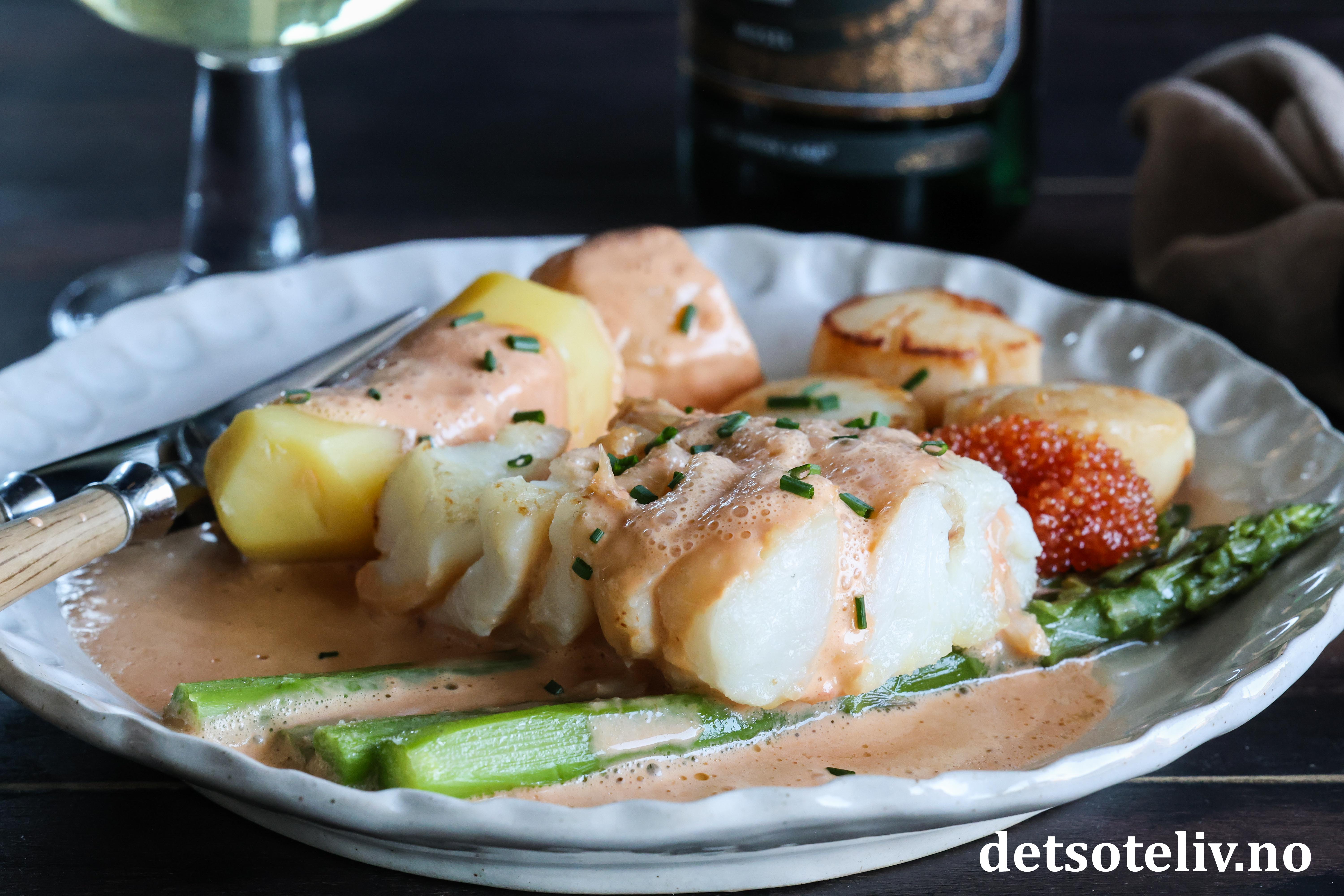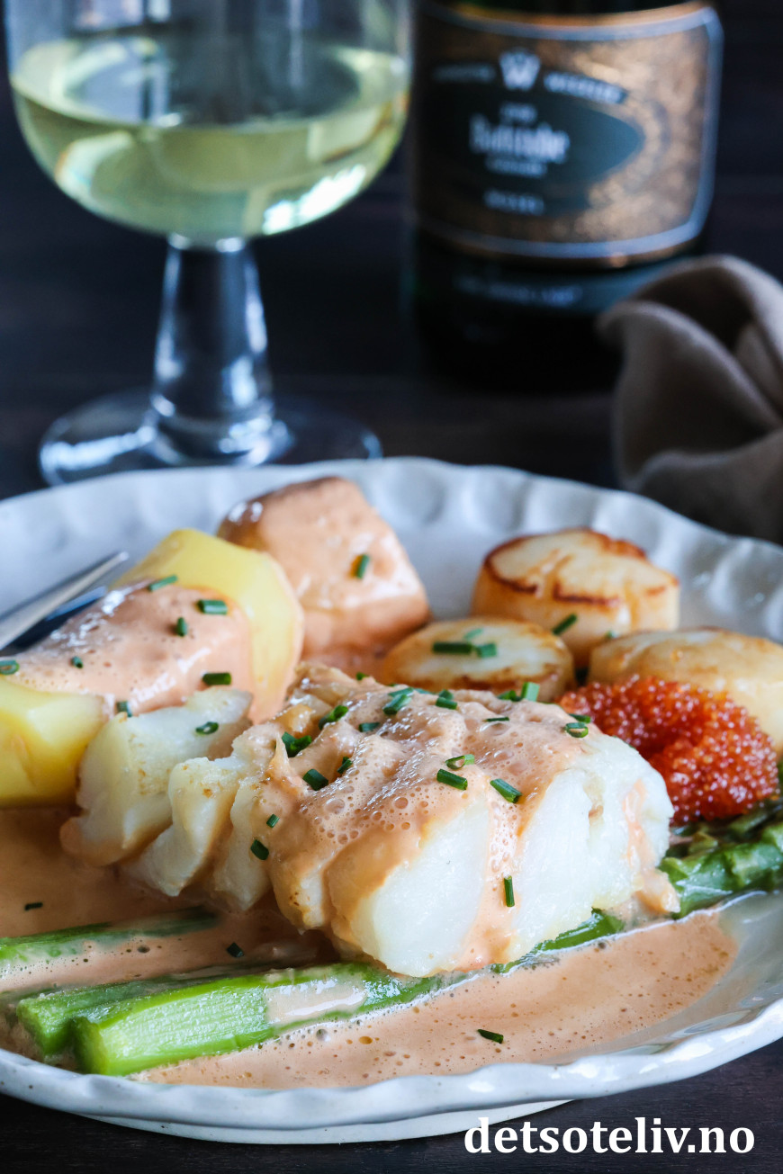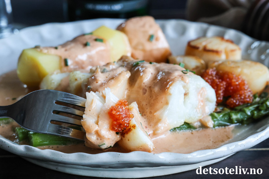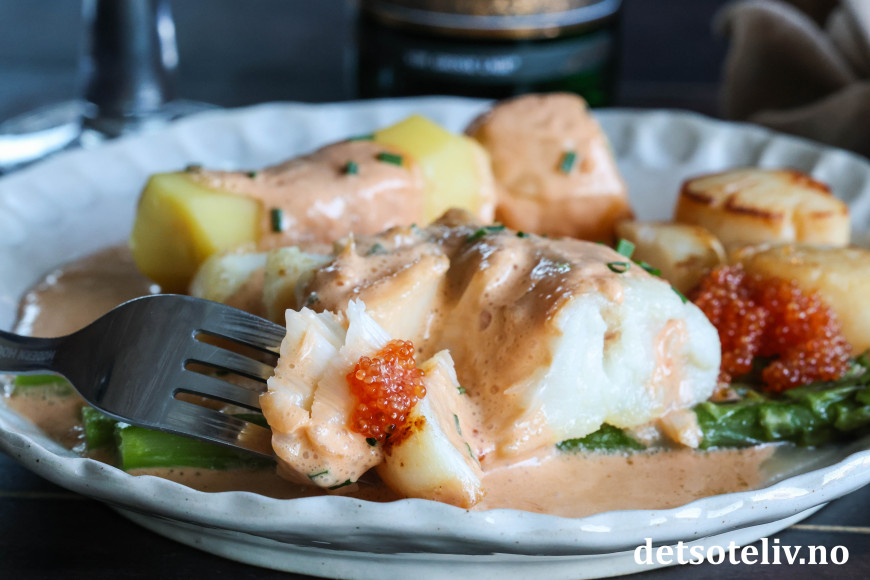 Her får den flotte fisken følge av smørstekte kamskjell, asparges, steinbitrogn og en fantastisk god og kremet skalldyrsaus.