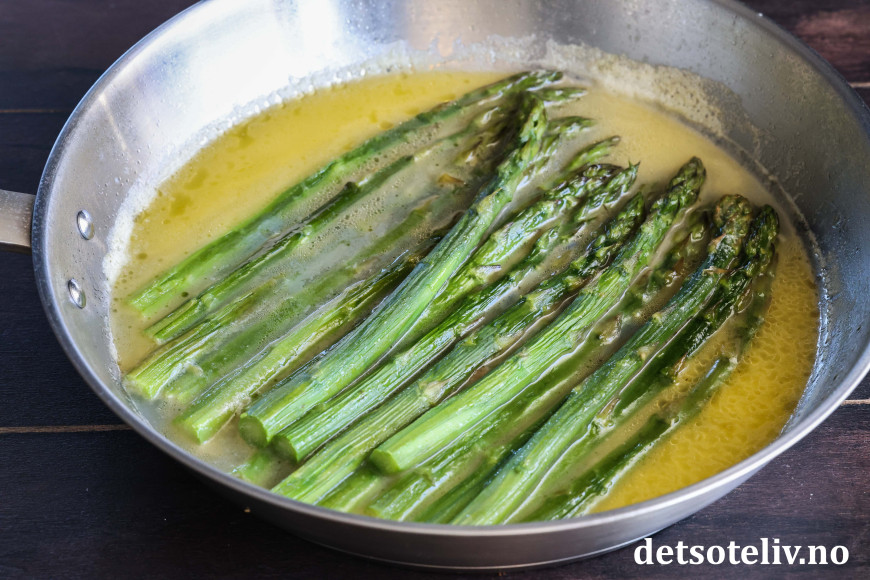 Kok mandelpoteter. La asparges trekke i lettsaltet vann og smør til de blir møre.